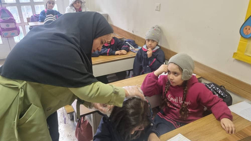 جلسه آموزش خودمراقبتی و معاینه پدیکلوز برای دانش آموزان دوره متوسطه و ابتدایی مدرسه منادی حق و فرهنگ نو